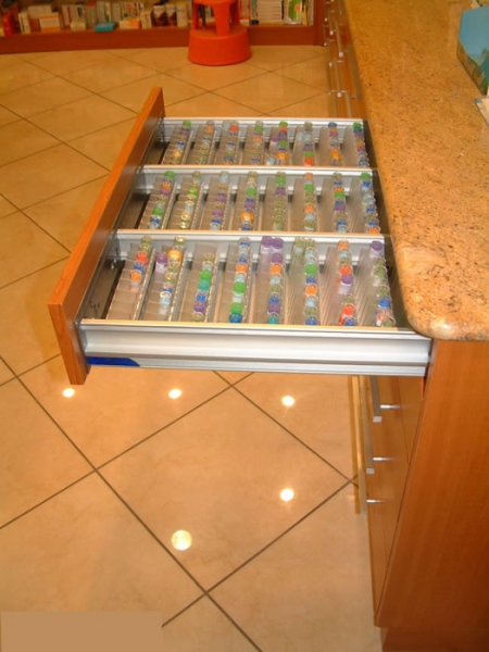 Gli scaffali hanno tutti i ripiani in vetro, le basi di ogni modulo sono realizzate con pratiche cassettiere per  le scorte dei prodotti.