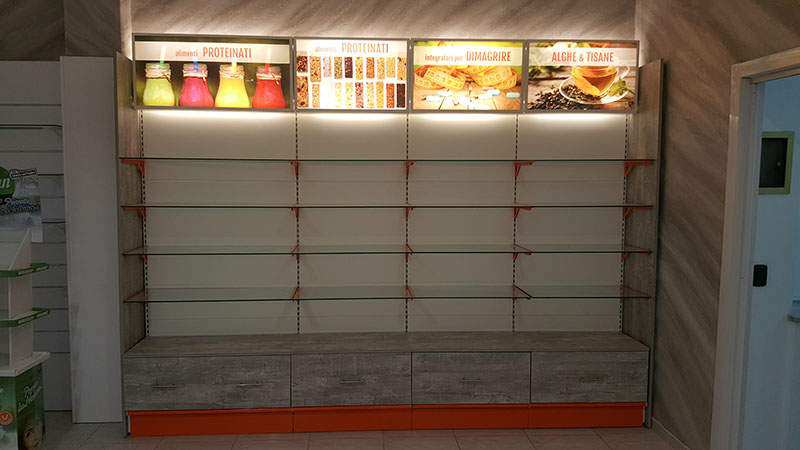 Alle spalle del banco vendita è presente una alta pannellatura dogata attrezzata con ripiani in vetro e reggi mensola in tinta arancione, stesso colore degli zoccolini.